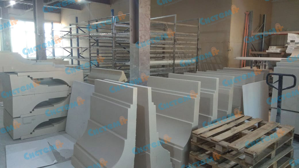 Предоставленный чертеж не нуждался в доработке, поэтому мы сразу приступили к подготовке материала для обработки. Так как ранее мы уже сотрудничали с заказчиком по другим проектам, он был знаком с качеством и свойствами материалов, с которыми мы работаем. Для производства карнизов он выбрал суспензионный беспрессовый самозатухающий пенополистирол. Выбор был обусловлен низкой ценой пенопласта в сравнении с бетонными и каменными аналогами, а также его эксплуатационными качествами вкупе со способностью к самозатуханию.